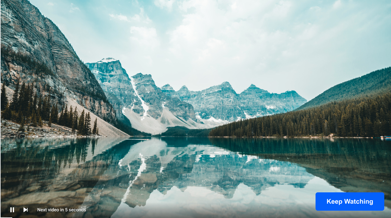 The Keep watching player feature controls when the player displays a configurable countdown timer and a Keep Watching button that allows a viewer to continue watching the current video. When the countdown completes without the viewer clicking the button, the player advances to the next video.